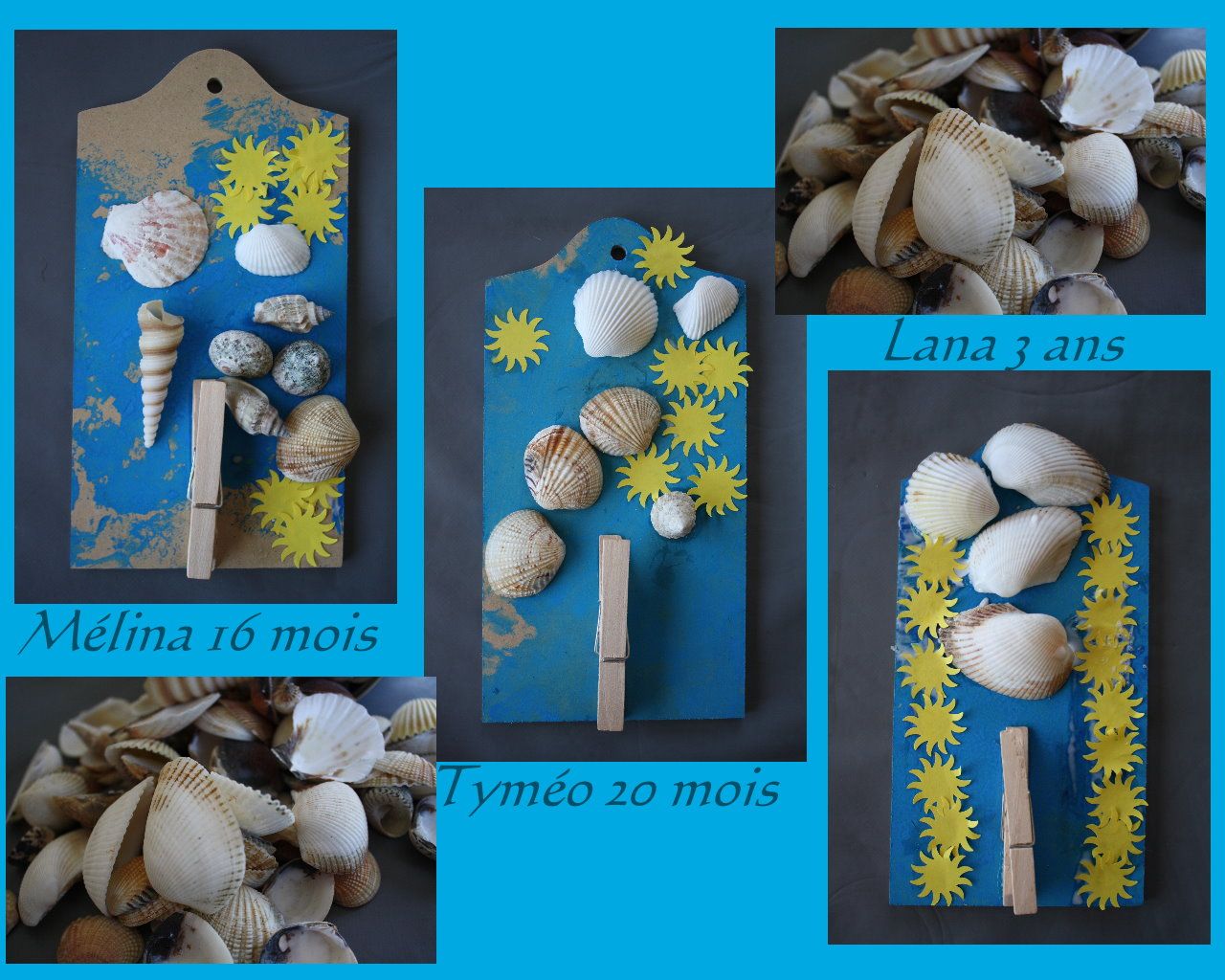 puis ils ont collé les coquillages et les soleils découpés à la perforatrice dans une feuille jaune.